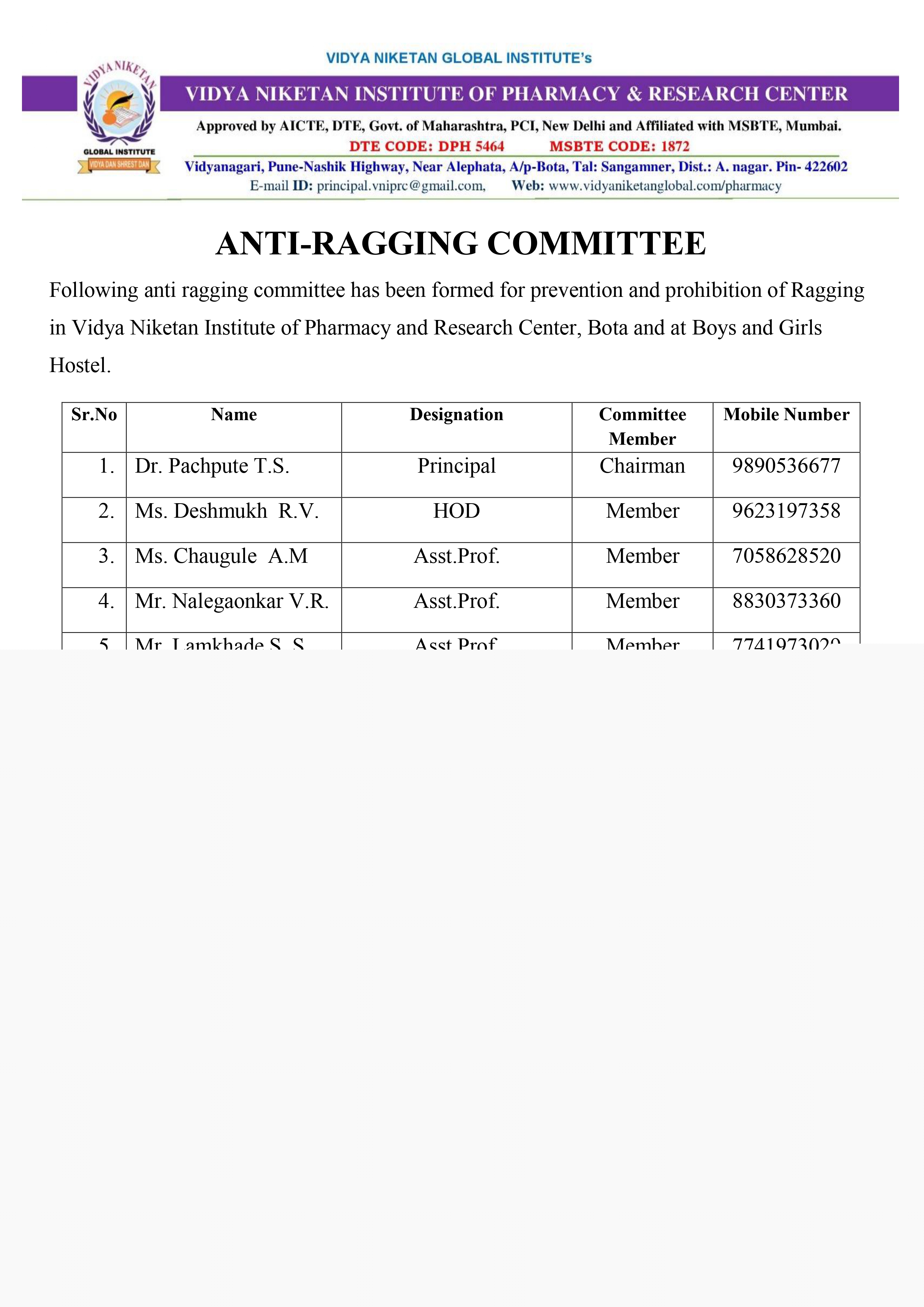 VIDYA NIKETAN INSTITUTE OF PHARMACY AND RESEARCH CENTER